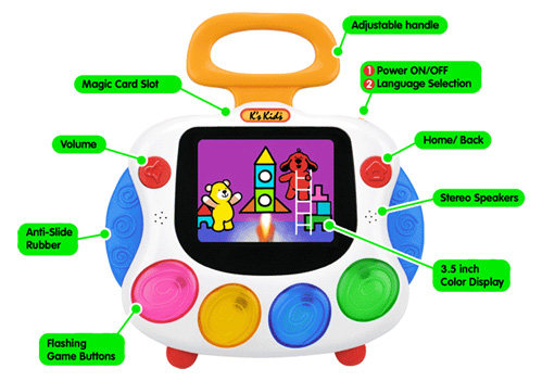 主要功能: 1. 内置卡通视频、教育游戏、英文单词、幼儿音乐等。 2. 适合0-6岁小朋友学习使用。 3. 支持四种语言,普通话、广东话、英文、日文。 4. 带16张游戏插卡。 5. 3.5寸真彩屏幕。 6. 3节5号电池供电,最长使用时间多达5小时。 产品外形: