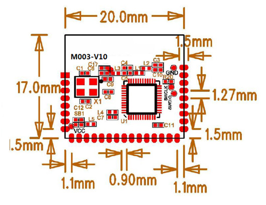 基本特性: 1. 支持BLE4.2,支持BLE5.0最高速率达到2Mbps 2. 内置cortex MO 芯片,最高速度达到48MHZ. 3. 内置SRAM 32KB,FLASH 256KB。 4. 最大可以使用28个IO 。 5. BLE 最大发射电流8mA,最大接收电流9.7mA。 产品外形: